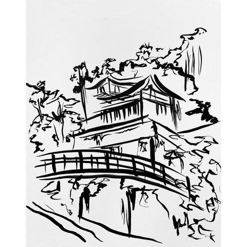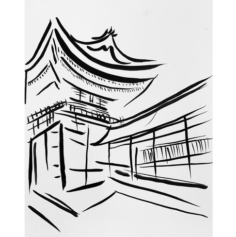 Following in the footsteps of Zen monks, “who painted in a quick and evocative manner to express their religious views and personal convictions” (Department of Asian Art, 2019), I began sumi-e sketches on A4 paper. With a bamboo brush and black ink, I repeated paintings from photographs I had taken in Japan of Zen Buddhist temples and Shinto Tori gates.
